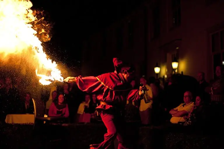 Het rijkelijk vermaak gaat verder wanneer de troubadour de feestzaal betreedt. Muzikale klanken vullen de ruimte en de hoofse liefde wordt vol overgave bezongen. Hierna is het tijd voor een geweldig spektakel! Afhankelijk van de locatie zal voor het kasteel een nar zorgen voor een show, waarbij brandende fakkels door de lucht vliegen en vlammen in het rond dansen. Dit wordt een avond om nooit te vergeten.